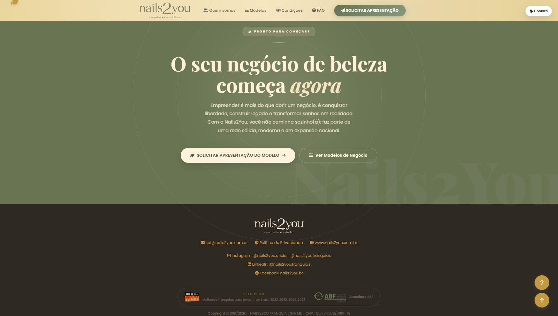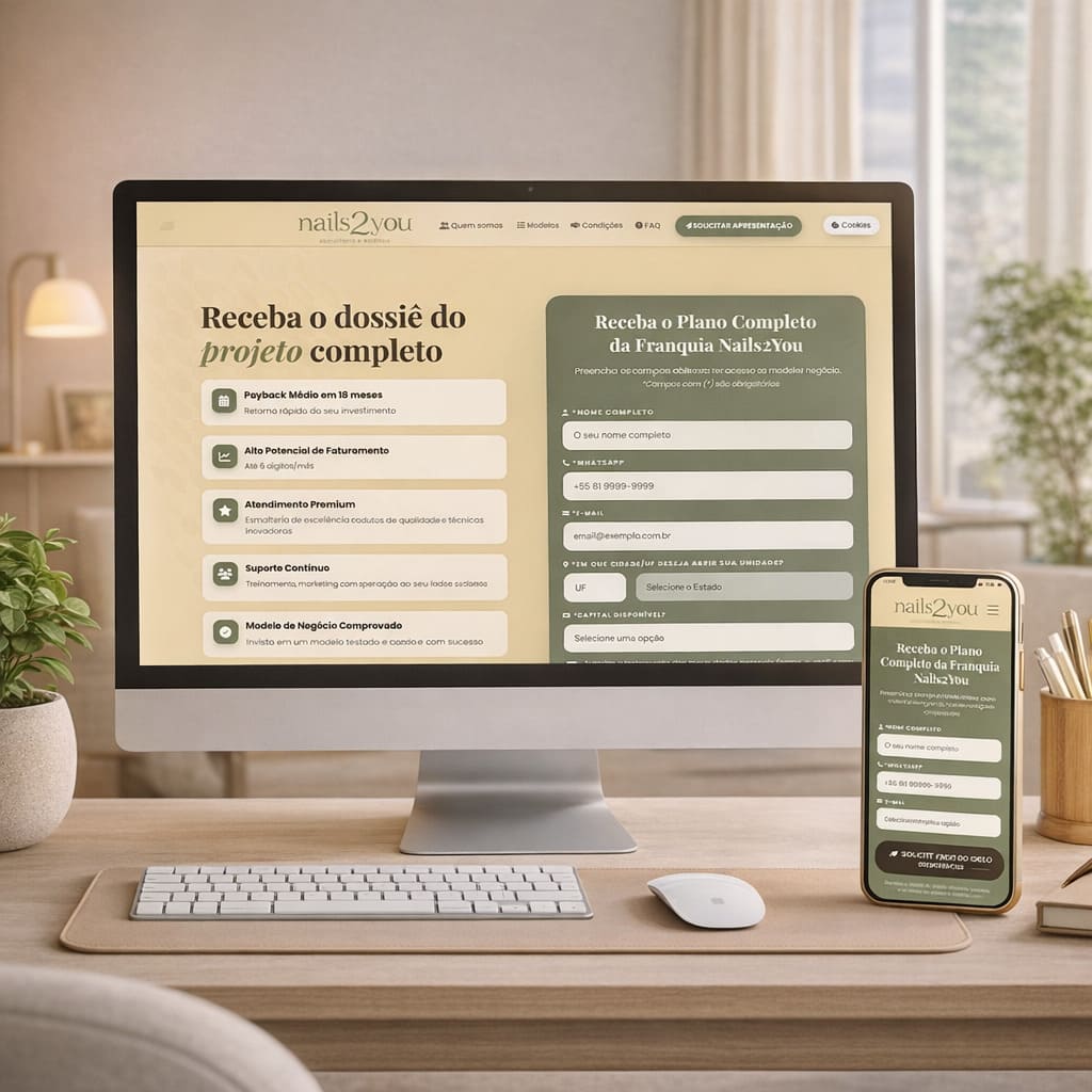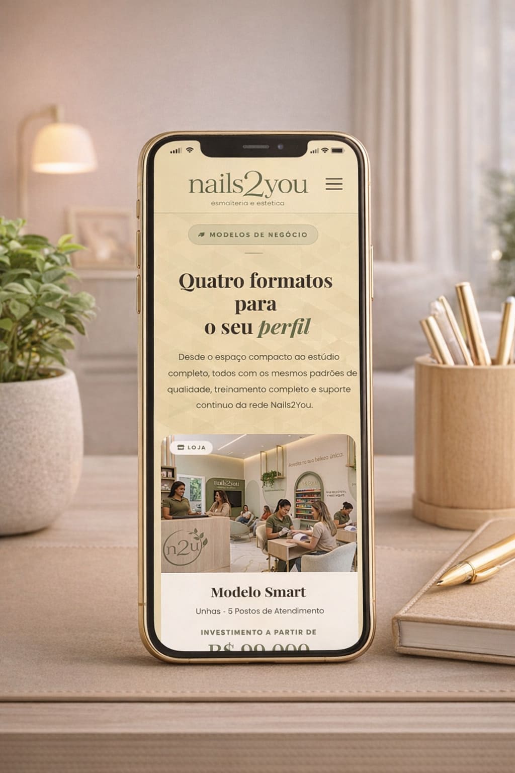 O projeto da Nails2You foi concebido com foco direto em expansão de franquias, transformando o website em um ativo comercial estratégico e não apenas institucional. A estrutura foi pensada para educar, qualificar e conduzir o usuário até a solicitação de apresentação, reduzindo fricções no processo de decisão.