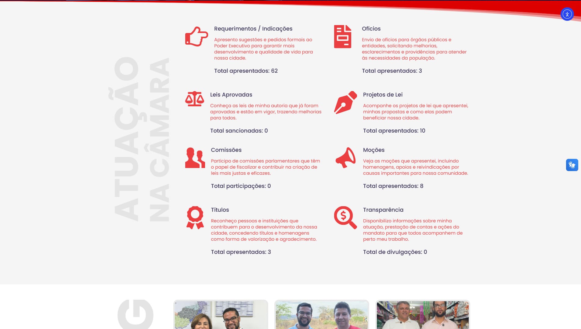 A estrutura do site priorizou clareza na apresentação das informações, navegação intuitiva e integração com redes sociais, criando um ambiente digital que fortalece a transparência e aproxima a atuação política da comunidade.